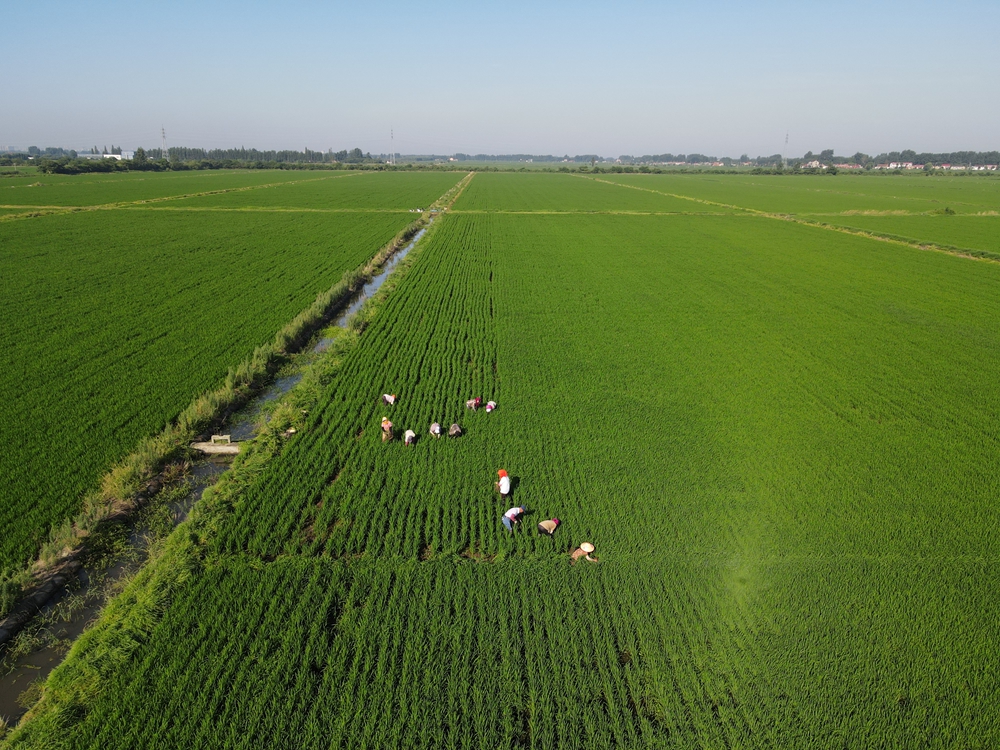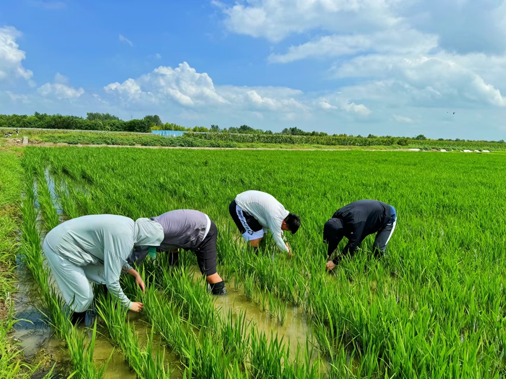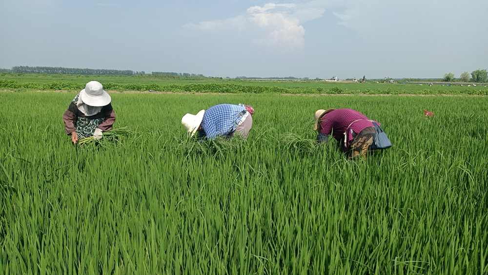 大圹圩农场公司水稻良种种植基地开展人工除草。(吴兵兵 摄)