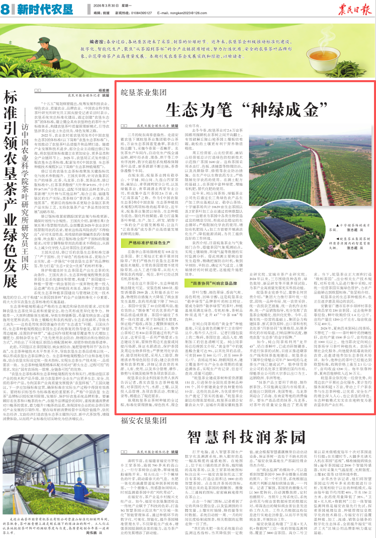 2026年3月30日出版的《农民日报》第8版《新时代农垦》专刊,刊登了《皖垦茶业集团 生态为笔 “种绿成金”》,全文如下——