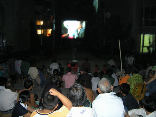 9月17日晚,潘村湖农场蟠龙花园小区中心广场上,居民正在观看久违的露天电影。