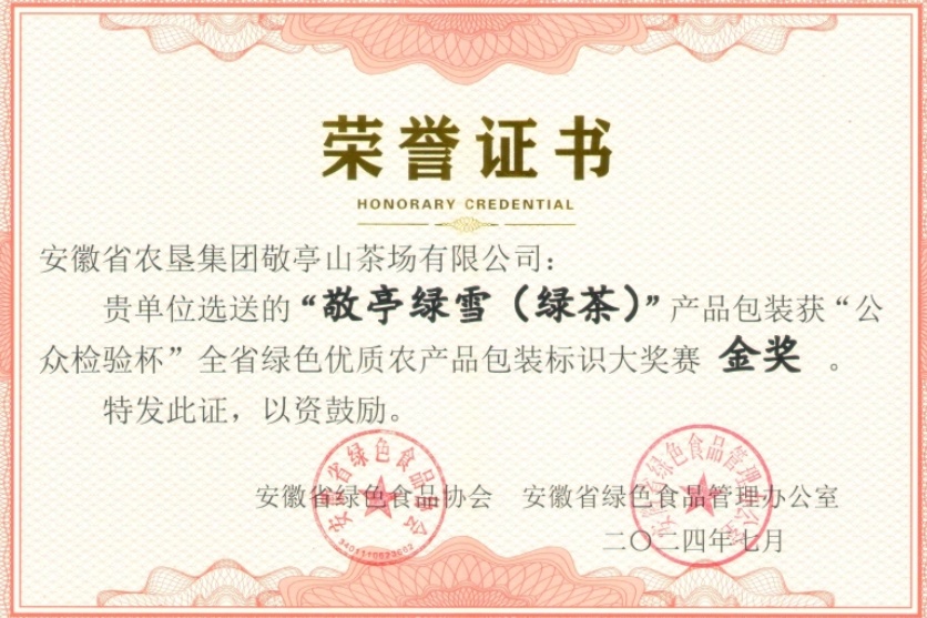 7月16日,由安徽省农业农村厅指导,安徽省绿色食品协会与安徽省绿色食品管理办公室联合主办的“公众检验杯”全省绿色优质农产品包装标识大奖赛颁奖典礼在合肥举行。敬亭山茶场公司选送的“敬亭绿雪”(绿茶)产品包装荣获大奖赛金奖。