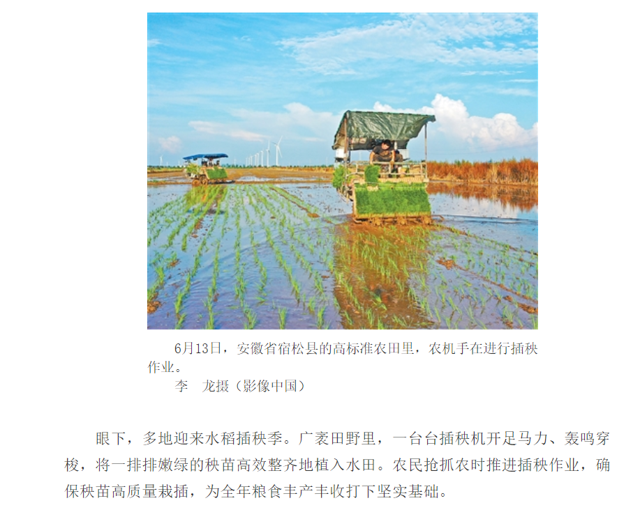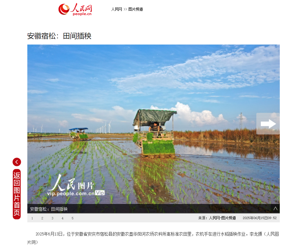 6月15日《人民网》首页和6月16日《人民日报》首版相继报道了开云手机登录入口华阳河农场夏种机插秧情况。