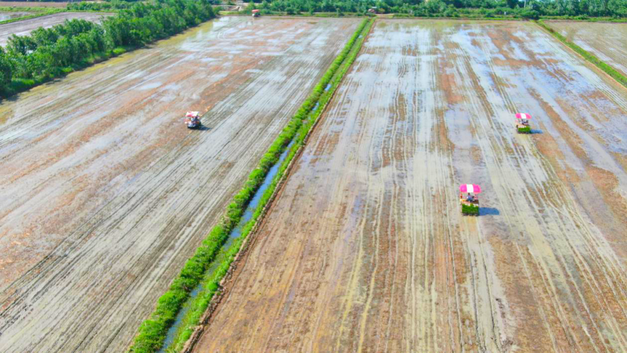 6月16日,淮南农场公司的农田里,多台红白相间的智能辅助驾驶插秧机正有序穿梭作业。农机手只需在操作终端设定好参数,插秧机便按照预设路线自动前行。其搭载的智能定位系统不仅能精准控制秧苗的行距、株距,更能根据稻田土壤的软硬程度,自主调节插秧深浅和力度,确保秧苗均匀入田。