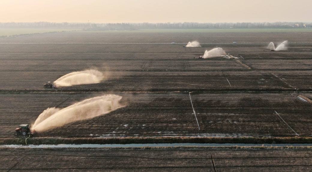 华阳河农场针对部分晚稻茬小麦土壤墒情不足的情况,迅速组织喷灌抗旱,实施精准补水,确保稻茬麦齐苗越冬。(李龙)
