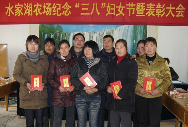 3月8日,水家湖农场召开纪念“三八”妇女节暨表彰大会,场领导刘国强、邵乃昌、吴红艳等出席会议并为评选出的场2010年度 “十佳女职工”和“文明家庭户”颁奖,与女职工们共同分享了节日的喜悦。