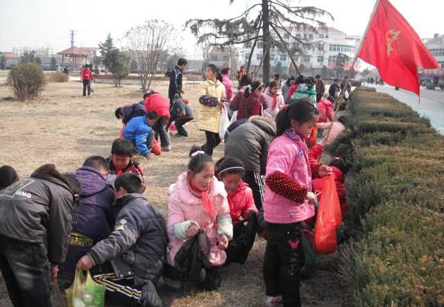 3月4日,龙亢农场小学少先队员们走出校门,在龙亢农场广场开展以“倡导文明,美化家园”为主题的义务劳动。草坪上、树丛下都是同学们的身影,他们半蹲着,用自带工具埋头捡纸头、拾果皮,不一会儿广场面貌焕然一新。